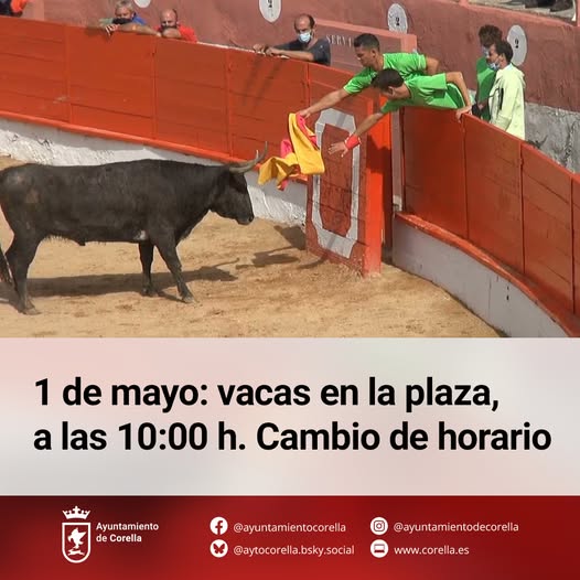 Con motivo de las Fiestas del Villar de Corella, se comunica que las Vacas en la Plaza, programadas inicialmente para mañana jueves, 1 de mayo, a las 12:00 horas, se adelantan a las 10:00 horas de la mañana.