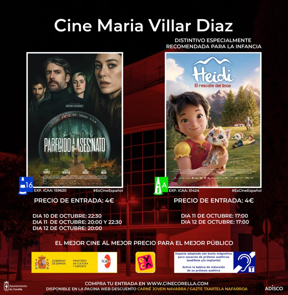 El Cine María Villar Díaz de Corella presenta su programación para el fin de semana del 10 al 12 de octubre, con dos títulos que combinan suspense y cine familiar: el thriller español “Parecido a asesinato” y la película de animación “Heidi: El rescate del lince”.
