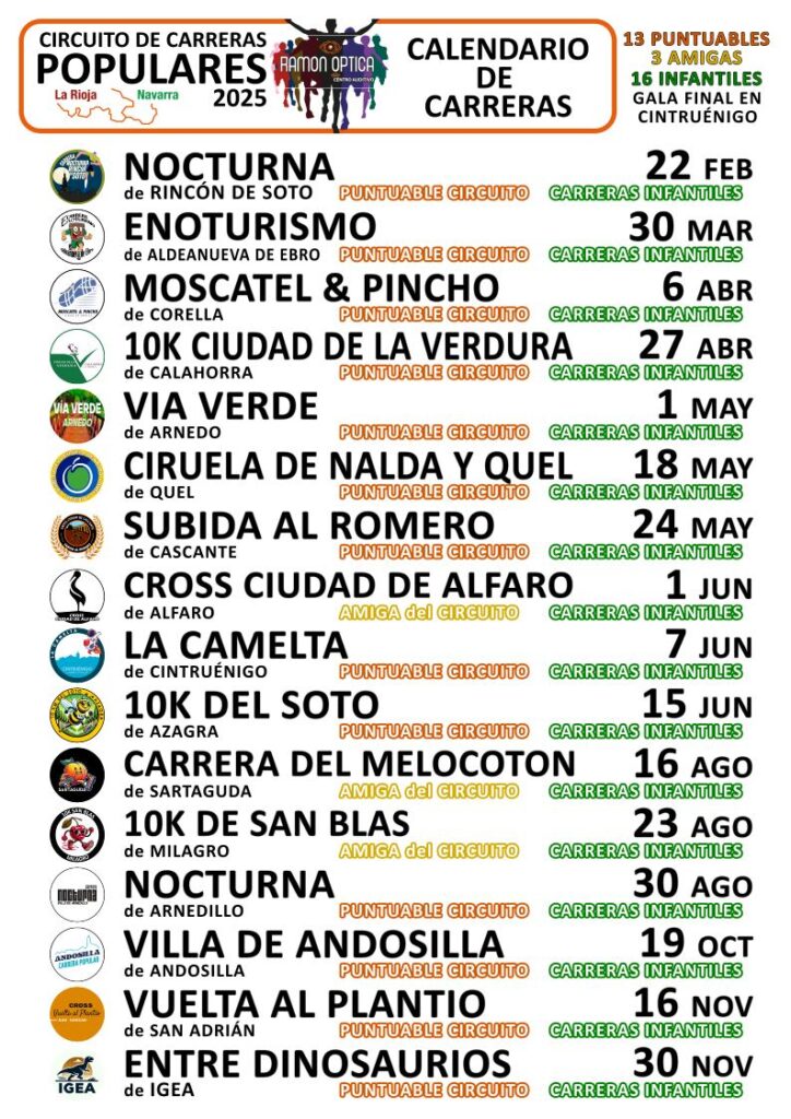 El circuito dará comienzo el 22 de febrero con la Carrera Nocturna de Rincón de Soto, seguido por eventos destacados como el Enoturismo de Aldeanueva de Ebro el 30 de marzo, y el Moscatel & Pincho de Corella el 6 de abril. El calendario continúa con la 10K Ciudad de la Verdura de Calahorra el 27 de abril y la Vía Verde de Arnedo el 1 de mayo, entre otros.