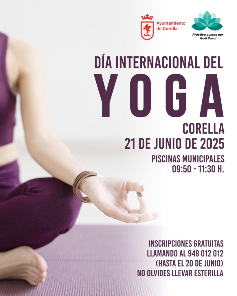 El próximo 21 de junio, la ciudad de Corella se suma a la celebración mundial del Día Internacional del Yoga con una práctica abierta que tendrá lugar en las Piscinas Municipales de 09:50 a 11:30 h. La sesión será guiada por Raúl Bozal y está pensada para todos los públicos, sin importar la edad o el nivel de experiencia.