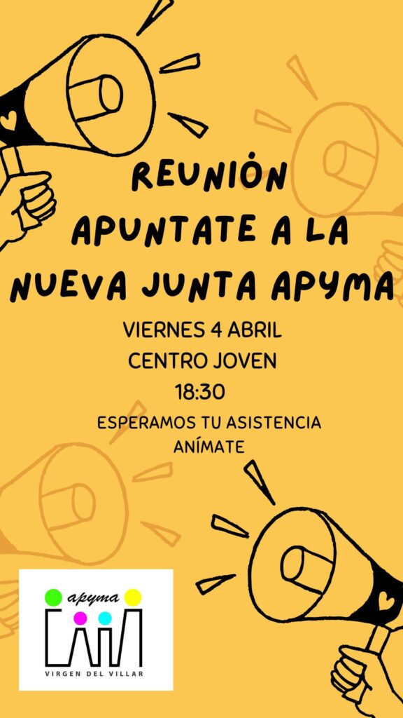La Asociación de Padres y Madres (APYMA) Virgen del Villar convoca a todos los miembros y a la comunidad educativa a participar en la reunión de la nueva junta directiva. El evento tendrá lugar el viernes 4 de abril, a las 18:30 horas, en el Centro Joven de Corella.