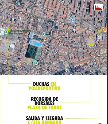 La recogida de dorsales y de la bolsa del corredor se realizará en la Plaza de Toros de Corella el sábado de 16:00 a 19:00 horas y el domingo de 8:30 a 10:30 horas. Durante la jornada del domingo únicamente se admitirán inscripciones para las carreras infantiles.