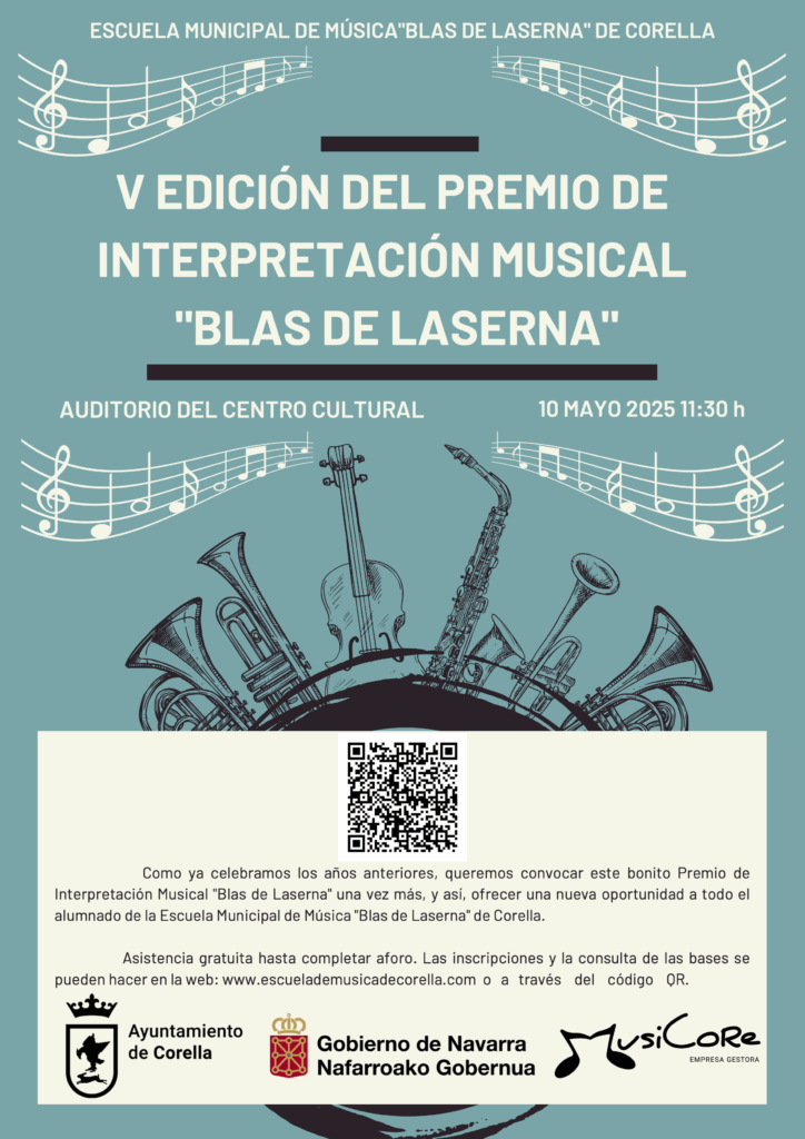 Este próximo sábado, 10 de mayo, a las 11:30 h, el Auditorio del Centro Cultural de Corella acogerá la V Edición del Premio de Interpretación Musical “Blas de Laserna”, una cita ya consolidada en el calendario cultural de la localidad y organizada por la Escuela Municipal de Música “Blas de Laserna” de Corella.
