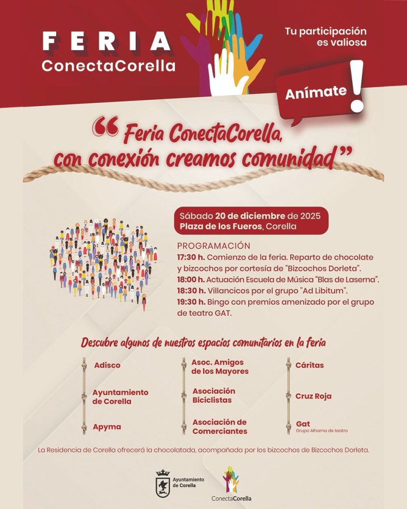 El próximo sábado 20 de diciembre de 2025, la Plaza de los Fueros de Corella acogerá la Feria ConectaCorella, una iniciativa que, bajo el lema “Con conexión creamos comunidad”, busca visibilizar el tejido asociativo local y fomentar la participación ciudadana en un ambiente festivo, inclusivo y abierto a toda la población.