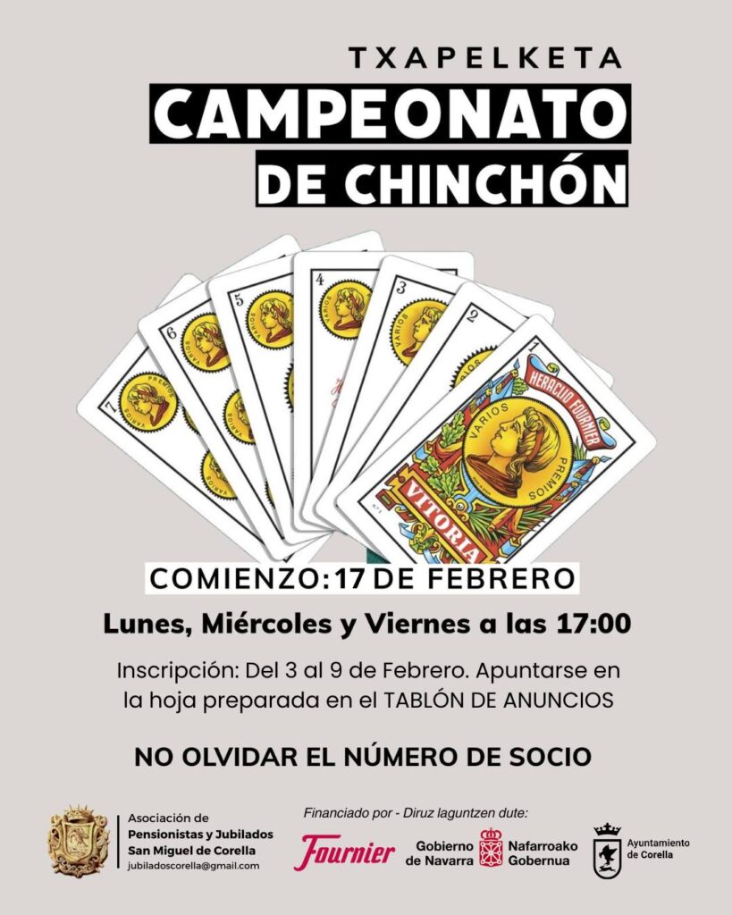 Corella se viste de gala para recibir a los entusiastas del Chinchón con el inicio del Campeonato de Chinchón organizado por la Asociación de Pensionistas y Jubilados “San Miguel”. Este evento, que se celebrará en los días lunes, miércoles y viernes a partir del 17 de febrero a las 17:00 horas, promete ser un punto de encuentro para los amantes de este tradicional juego de cartas, ofreciendo un espacio para la competencia amistosa y el entretenimiento.