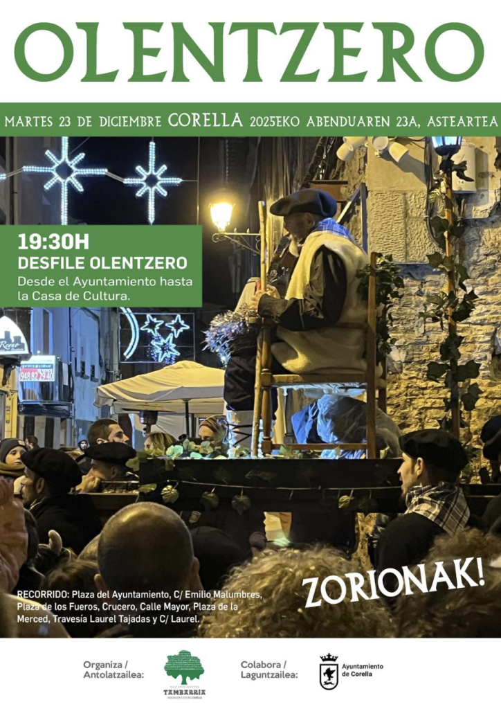 Corella se prepara para vivir una de las citas más esperadas de la Navidad. Mañana martes, 23 de diciembre, el Olentzero volverá a recorrer las calles de la localidad en un desfile cargado de tradición, música y animación, que promete reunir a vecinas y vecinos de todas las edades.