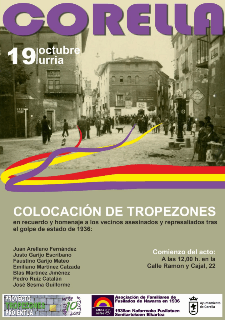 El Proyecto Tropezones, impulsado por AFFNA 36, busca recuperar la memoria de las víctimas del franquismo colocando pequeñas placas conmemorativas —los llamados tropezones— frente a las casas donde vivieron o fueron detenidas las personas asesinadas, desaparecidas o represaliadas. En Corella, el homenaje recordará a Juan Arellano Fernández, Justo Garijo Escribano, Faustino Garijo Mateo, Emiliano Martínez Calzada, Blas Martínez Jiménez, Pedro Ruiz Catalán y José Sesma Guillorme.