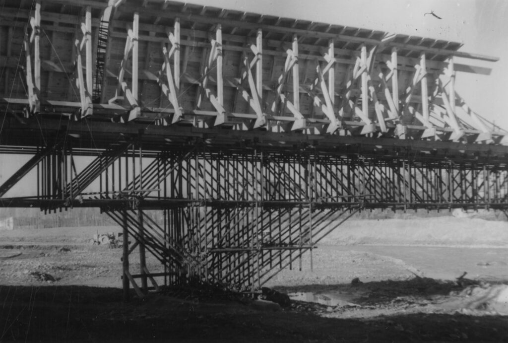 El 25 de enero de 1962, la obra ya estaba en marcha. Se había instalado el encimbrado metálico en el cauce y sobre él comenzaban los trabajos de encofrado en madera para la primera viga. Fue ese el instante que inmortalizó el fotógrafo —probablemente enviado por la Dirección de Caminos— cuya imagen se conserva hoy entre los archivos, con el sello de Zubieta y Retegui de Pamplona y el nombre del ingeniero Manuel Sainz de los Terreros anotado al dorso. Una imagen pequeña (7×10 cm), pero cargada de simbolismo.