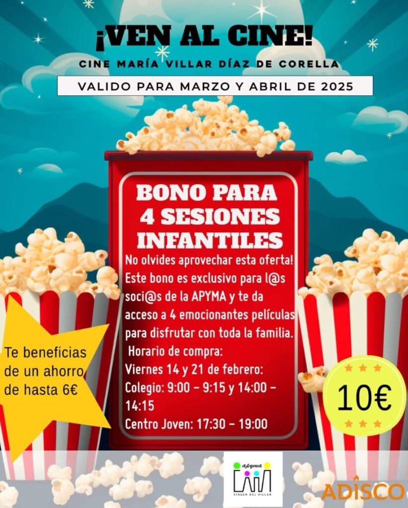 ¡Este marzo y abril, las familias de Corella tienen una cita con el cine! El Cine María Villar Díaz lanza una oferta imperdible para los socios de la APYMA y sus familias: un bono para 4 sesiones de cine infantil por solo 10 euros. Este bono no solo promete diversión familiar sino también un ahorro considerable de hasta 6 euros.