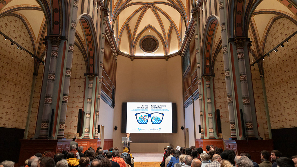 Al mediodía, el grupo asistió en el Salón Pinaquy al acto Cocina para tus ojos 2.0, organizado por la Fundación Ojos del Mundo / Munduko begiak. El evento reunió a más de un centenar de asistentes y contó con la presencia del director general de Educación y Formación Profesional, Gil Sevillano, y de la técnica de Cooperación Internacional del Gobierno de Navarra, Esther Ochoa.