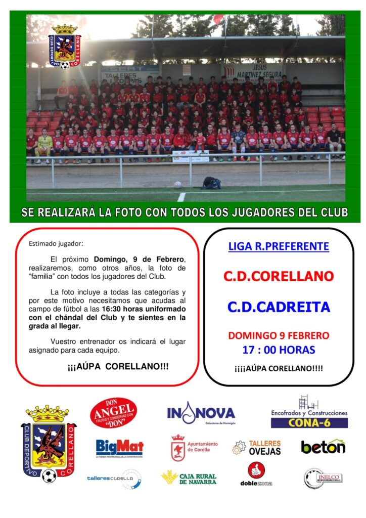 Este domingo, 9 de febrero, el Club Deportivo Corellano tiene programado un día especial que comenzará con la tradicional fotografía de familia en el campo de fútbol a las 16:30 horas, seguido de un apasionante partido de la Liga R. Preferente frente al C.D. Cadretta a las 17:00 horas.