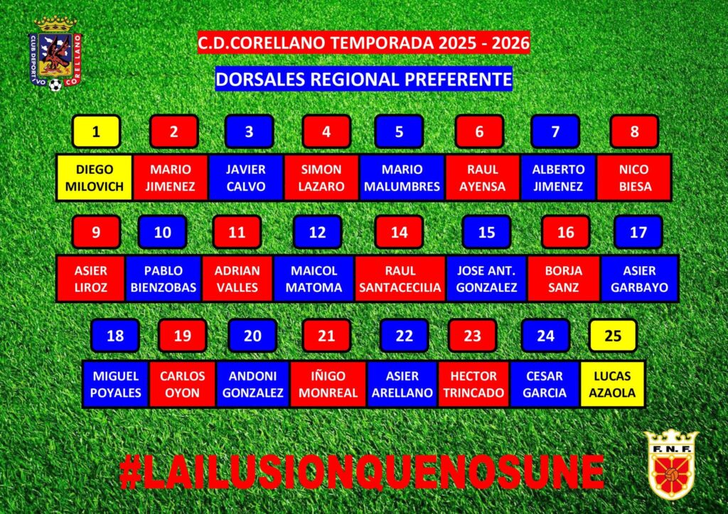 El C.D. Corellano ya tiene definidos los dorsales que sus jugadores lucirán durante la temporada 2025/2026 en Regional Preferente. La plantilla al completo ha elegido los números con los que defenderá los colores del club en un curso cargado de ilusión y ambición deportiva.