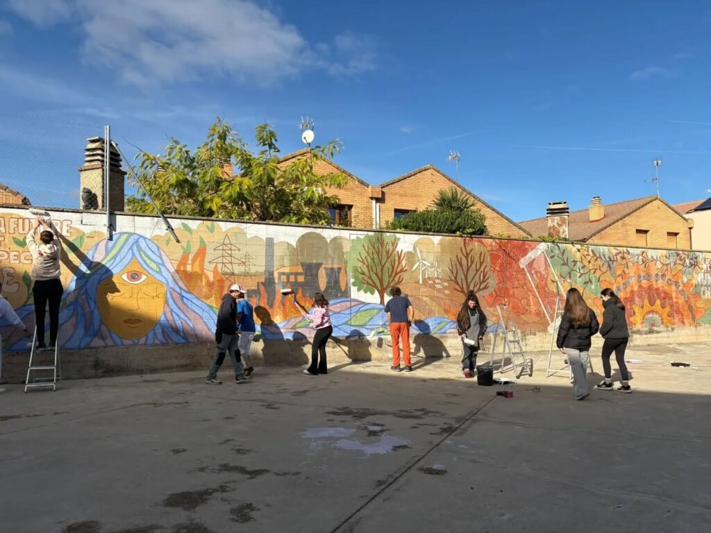 El IES Alhama ha finalizado este fin de semana el segundo mural Erasmus desarrollado en el marco del proyecto europeo “Generaciones Pedaleando por la Inclusión y la Acción Climática”. La obra, fruto de un mes de trabajo continuo, ha sido realizada por 22 estudiantes Erasmus del centro bajo la dirección de la ingeniera y muralista corellana Diana Ayensa Jiménez, antigua alumna del instituto y residente actualmente en Chile.