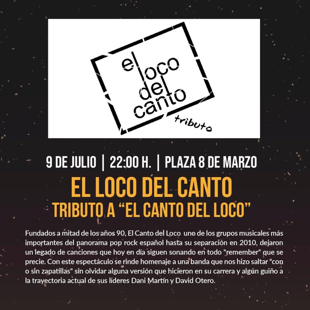 El ciclo “Música en la Noche” continúa esta noche, miércoles 9 de julio, con la actuación de El Loco del Canto, una banda tributo al mítico grupo español El Canto del Loco, uno de los referentes del pop-rock nacional de las últimas décadas. El concierto comenzará a las 22:00 horas en la Plaza 8 de Marzo, como parte de la programación cultural del Ayuntamiento de Corella para este mes de julio.