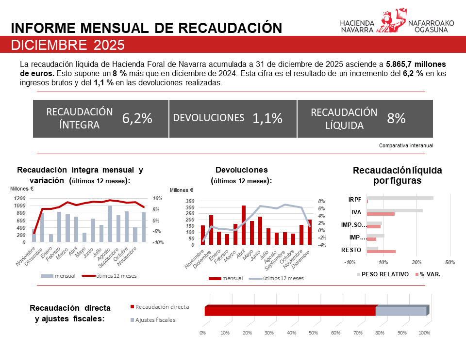 La recaudación líquida acumulada de la Hacienda Foral de Navarra en el acumulado de 2025 alcanzó los 5.865,7 millones de euros, 432,7 millones de euros más de los 5.433 millones ingresados en 2024. Esta cifra representa un incremento del 8% interanual, consecuencia del 6,2% más en la recaudación íntegra y del 1,1% más en las devoluciones. La buena evolución de los principales indicadores macroeconómicos ha apoyado este positivo comportamiento tributario.