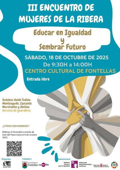 El próximo sábado 18 de octubre de 2025, el Centro Cultural de Fontellas acogerá el III Encuentro de Mujeres de la Ribera, una cita que, bajo el lema “Educar en Igualdad y Sembrar Futuro”, reunirá a profesionales del ámbito educativo, social y cultural con el objetivo de reflexionar sobre la coeducación y la igualdad de género como herramientas esenciales para construir una sociedad más justa y libre de violencias.