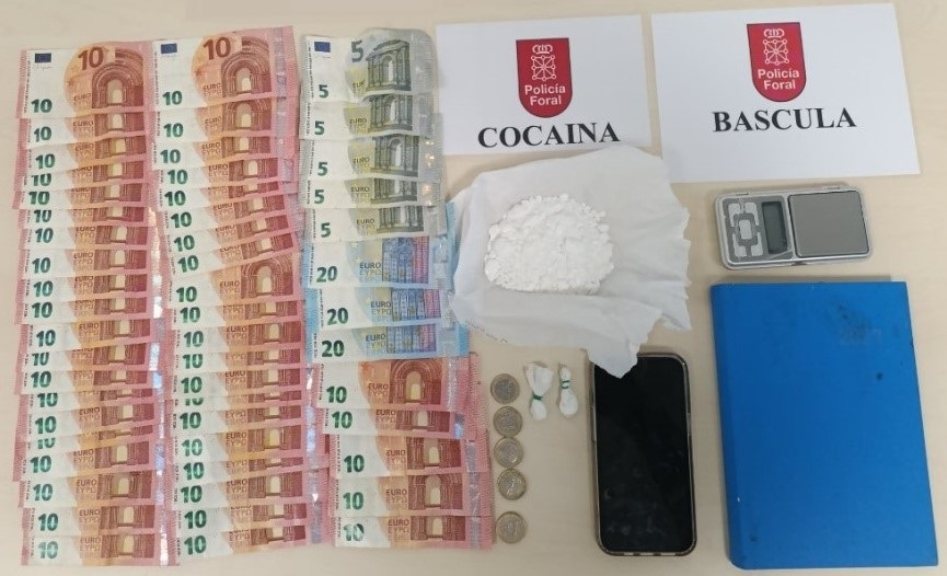 Policías forales de seguridad ciudadana y policía judicial establecieron un dispositivo de vigilancia, confirmando un continuo trasiego de personas a comprar cocaína, por lo que se realizó una redada en colaboración con agentes de intervención y guías caninos de Policia Foral. Durante la inspección se localizaron 55 gramos de cocaína, varios de ellos ya preparados en bolsitas de un gramo para su distribución, 785 € en metálico y una báscula de precisión.