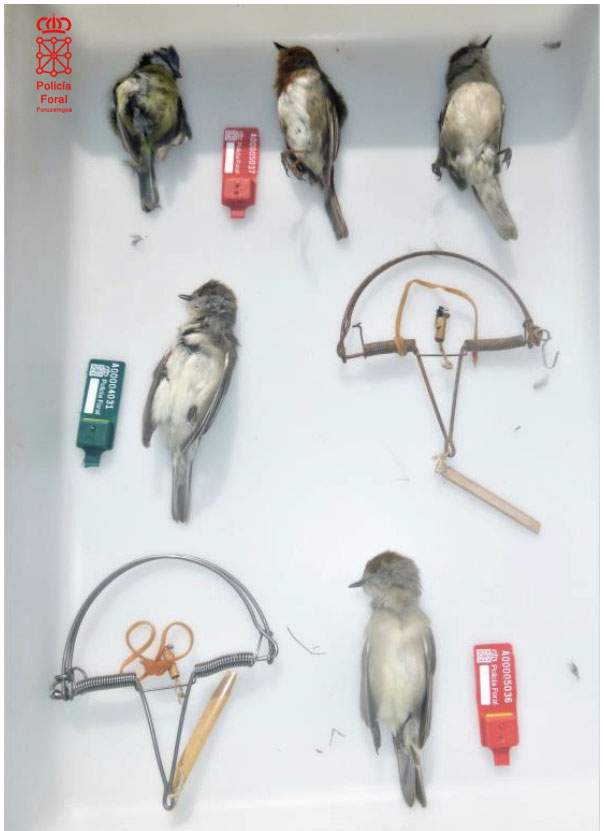 Las aves cazadas -herrerillo común, petirrojo y curruca capirota- son insectívoras y están protegidas según el Listado LESPE (Especies Silvestres en Régimen de Protección Especial). Con la utilización de estos cepos se da captura y muerte de forma no selectiva a aves paseriformes, utilizando como cebo hormigas aladas.