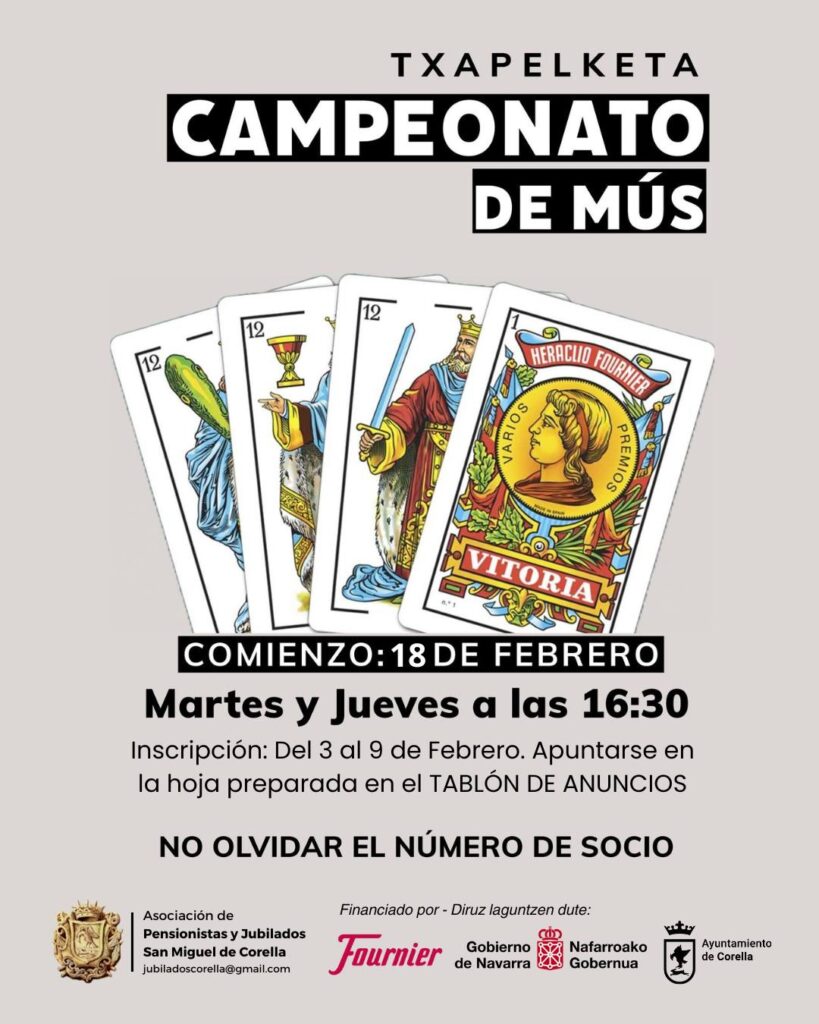 Corella se prepara para acoger su tradicional Campeonato de Mus, que dará inicio el próximo 18 de febrero, ofreciendo a los entusiastas de este popular juego de cartas una oportunidad de demostrar sus habilidades y disfrutar de la competencia amistosa. El evento, organizado por la Asociación de Pensionistas y Jubilados “San Miguel” de Corella, se llevará a cabo los martes y jueves a las 16:30 horas.