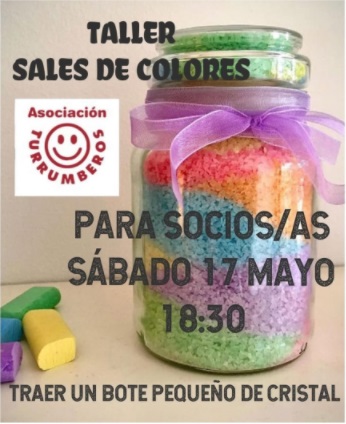 La Asociación Turrumberos invita a todos sus socios y socias a participar en un original y divertido Taller de Sales de Colores, que se celebrará el próximo sábado 17 de mayo a las 18:30 horas.