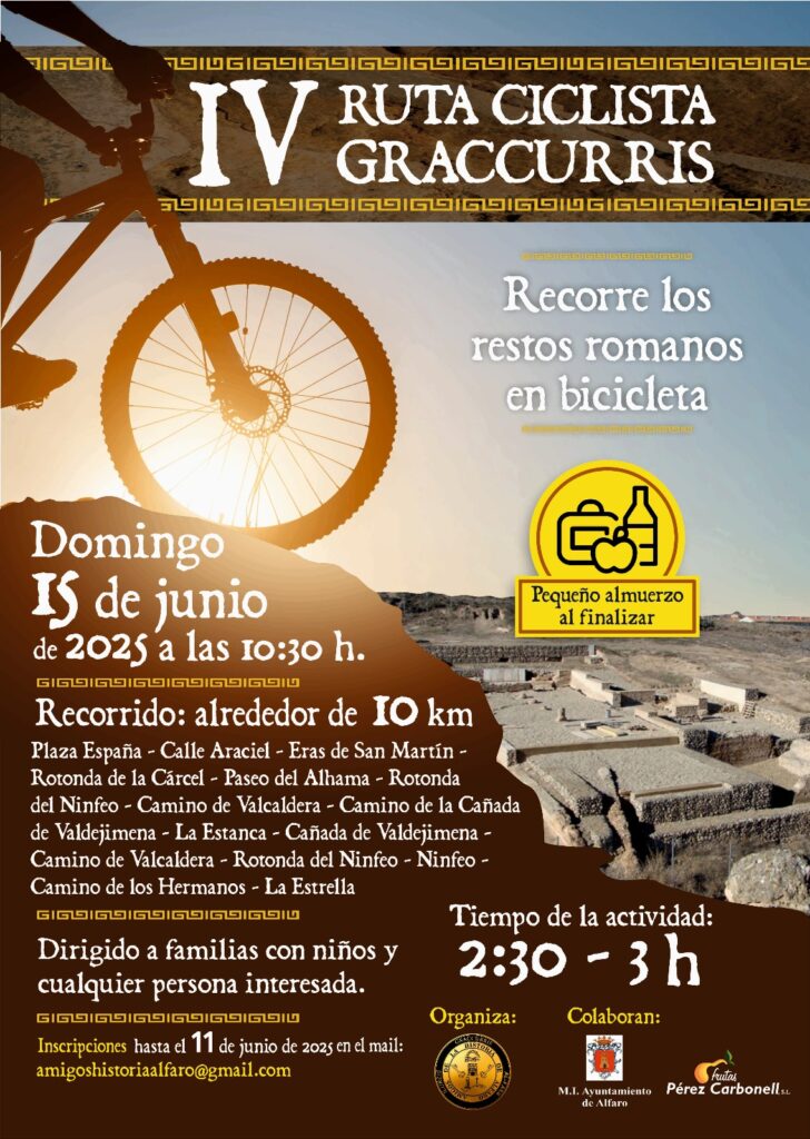 ¿Te gusta la bicicleta? ¿Te apasiona la historia? Entonces no puedes perderte la IV Ruta Arqueociclista GRACCURRIS, una actividad que aúna deporte, patrimonio y convivencia familiar. El Ayuntamiento de Alfaro y la Asociación de Amigos de la Historia te invitan a recorrer en bicicleta los principales restos arqueológicos de la ciudad el próximo domingo 15 de junio de 2025, a las 10:30 horas, con salida desde la Plaza de España.