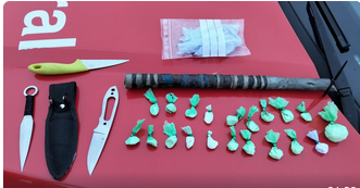 Con motivo de los controles preventivos de las fiestas patronales de Noáin, se investiga a un varón por un delito contra la salud pública, al intervenirle en su vehículo 30 gramos de cocaína preparados para la venta. También portaba armas blancas (dos cuchillos lanzadores, un cuchillo de cocina y una defensa de madera), por lo que se le imputa igualmente un delito de tenencia ilícita de armas.