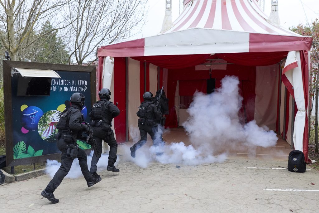 La Policía Foral ha realizado esta tarde un simulacro de cuatro situaciones de emergencia distintas en el parque de Sendaviva, en Arguedas. En concreto, se ha simulado el escape de un tigre de su recinto perimetral, el hallazgo de una mochila sospechosa en el circo, la presencia del sospechoso de haberlo colocado dentro del parque, y un secuestro con varios rehenes.