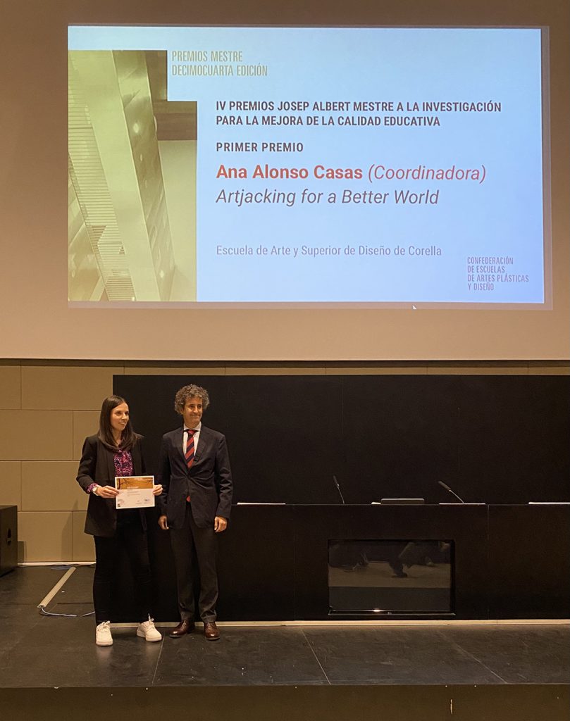 Zaragoza acogió el pasado viernes, 7 de noviembre, el acto de entrega de la decimocuarta edición del Premio Josep Albert Mestre a la Investigación para la Mejora de la Calidad Educativa, convocado por la Confederación de Escuelas de Artes Plásticas y Diseño (CEA), que reúne a centros de todo el país. En esta edición, la Escuela de Arte y Superior de Diseño de Corella (EASDi) obtuvo el Primer Premio a la Innovación Docente 2025, un reconocimiento de ámbito nacional por el proyecto Artjacking for a Better World, coordinado por la profesora Ana Alonso Casas.
