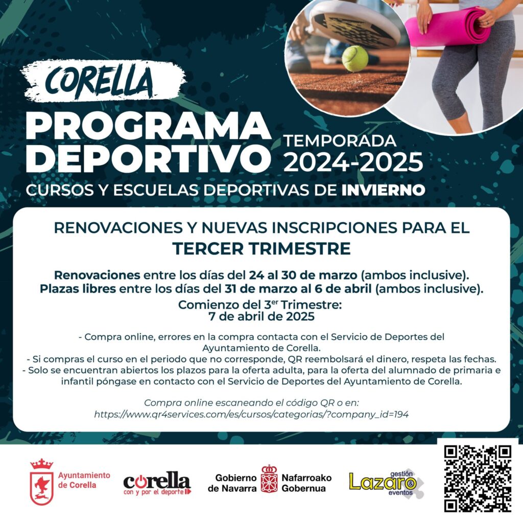 El Ayuntamiento de Corella anuncia la apertura del periodo de renovaciones y nuevas inscripciones para el tercer trimestre de los cursos deportivos del municipio. A partir del 24 de marzo hasta el 30 de marzo de 2025, los actuales participantes podrán renovar su inscripción, mientras que las nuevas plazas estarán disponibles del 31 de marzo al 6 de abril.