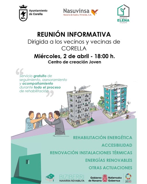 El Ayuntamiento de Corella en colaboración con Nasuvinsa y el apoyo del Gobierno de Navarra, invita a todos los vecinos y vecinas de Corella a una reunión informativa que tendrá lugar el próximo miércoles, 2 de abril a las 18:00 horas en el Centro de Creación Joven. El encuentro tiene como objetivo detallar los servicios y ayudas disponibles para la rehabilitación energética, mejora de accesibilidad, renovación de instalaciones térmicas, implementación de energías renovables, y otras actuaciones relacionadas.