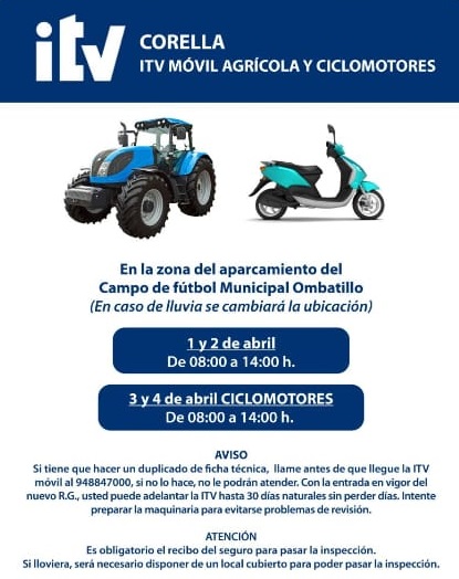 El Ayuntamiento de Corella informa a los residentes que el servicio de Inspección Técnica de Vehículos (ITV) móvil estará disponible en el municipio para vehículos agrícolas y ciclomotores. Este servicio itinerante es una iniciativa para facilitar la revisión de estos vehículos, asegurando su correcto funcionamiento y seguridad en la carretera.
