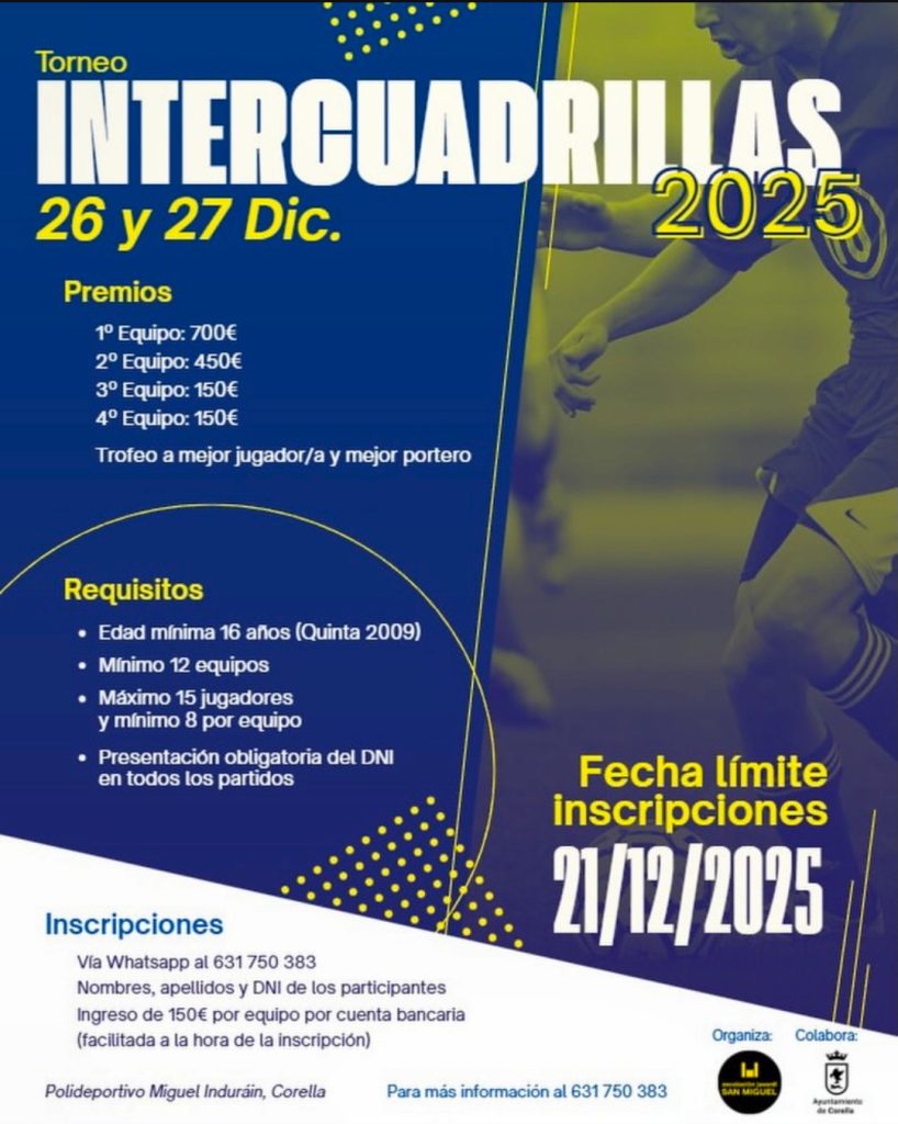 El Polideportivo Miguel Induráin de Corella será la sede del Torneo Intercuadrillas 2025 de fútbol, que se llevará a cabo los días 26 y 27 de diciembre.