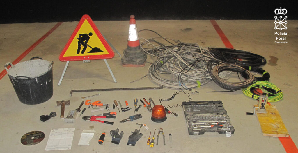 Tras la detención los policías forales se incautaron de diverso material, como herramientas, cable, máquina peladora de cable, señales de obra, conos de señalización, señal luminosa para la furgoneta (“pirulo”) y anotaciones con el nombre de calles y localización de las arquetas, todo ello con la finalidad de aparentar que estaban realizando trabajos autorizados, cuando realmente estaban cometiendo los robos. La colaboración ciudadana, con el testimonio de varios testigos, así como las cámaras de seguridad de los lugares en los que ocurrieron los hechos, fueron claves para dar con los autores, cuyos hechos habrían provocado unas pérdidas económicas superiores a los 30.000 € a los diferentes ayuntamientos de las localidades afectadas.