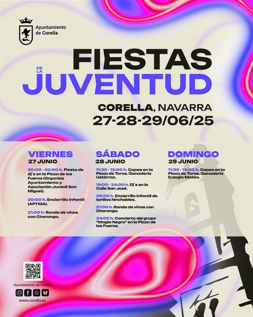 El Ayuntamiento de Corella, en colaboración con la Asociación Juvenil San Miguel y otras entidades locales, presenta una nueva edición de las esperadas Fiestas de la Juventud, que se celebrarán los días 27, 28 y 29 de junio de 2025. Tres jornadas repletas de música, diversión, encierros infantiles, charangas, capeas y actividades pensadas especialmente para el público joven.