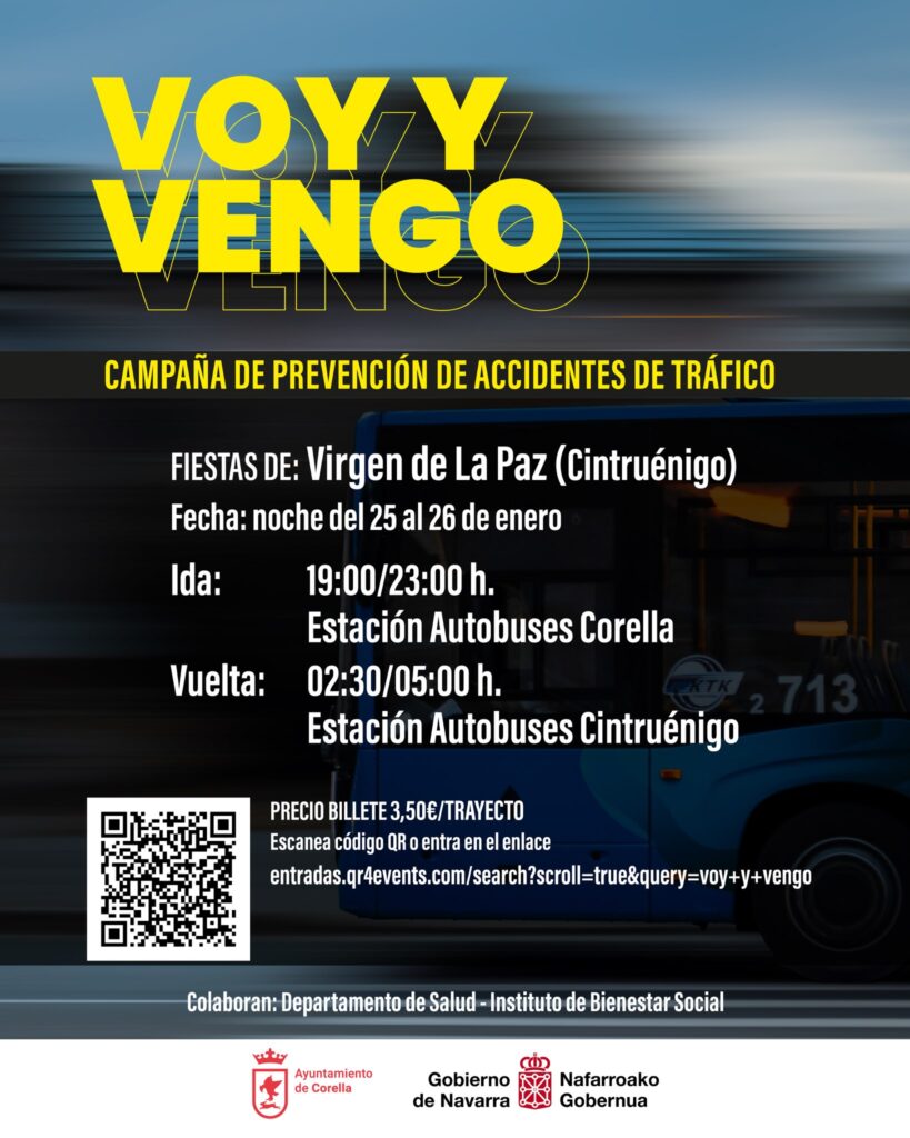 El Ayuntamiento de Corella, en colaboración con el Gobierno de Navarra y el Departamento de Salud – Instituto de Bienestar Social, han organizado la campaña “Voy y Vengo” como parte de las iniciativas de prevención de accidentes de tráfico durante las fiestas de la Virgen de La Paz en Cintruénigo.